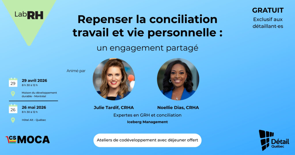Animés par Julie Tardif et Noellie Dias, deux expertes en GRH et conciliation chez Iceberg Management, les ateliers du LabRH 2026 offriront un espace d’échange entre détaillant·es et professionnel·les RH qui font face à des réalités similaires.